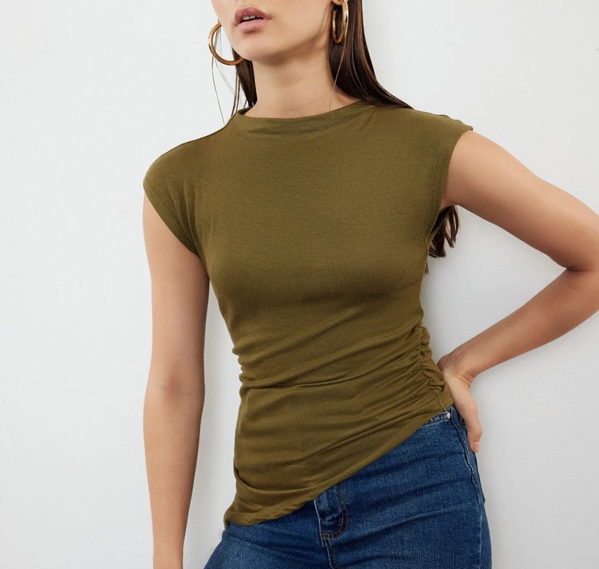 Haki renkli, kolsuz, bisiklet yaka ve parlak keten kumaştan yapılmış, vücuda oturan bu bluz rahat ve şık bir günlük sokak stili sunar.