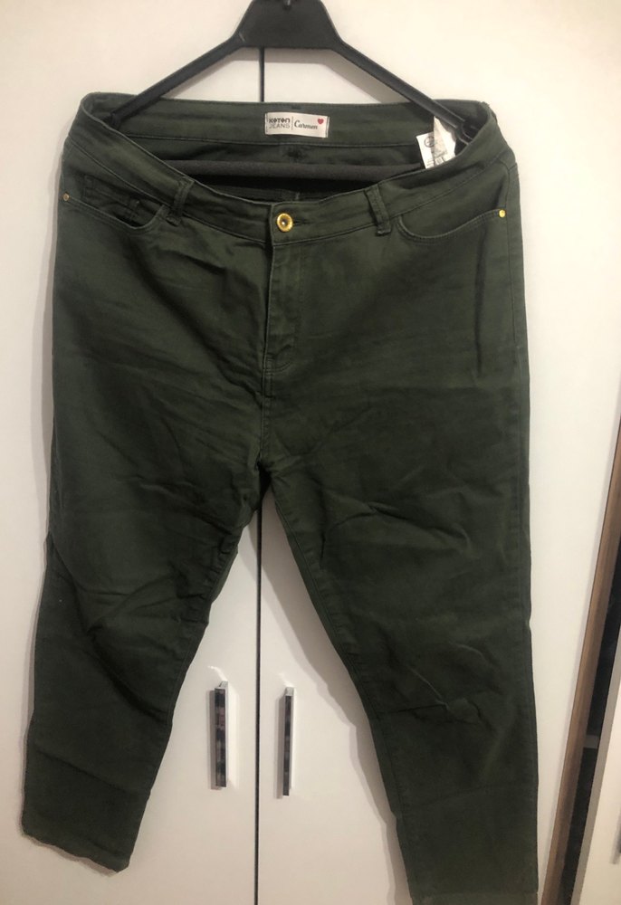 Koyu haki renkli, normal boy ve regular fit kadın kumaş pantolon. Sentetik kumaştan üretilmiştir, günlük rahat kullanıma uygundur.