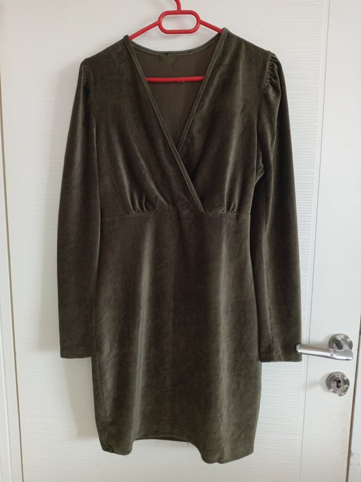 Uzun kollu, V yaka, kahverengi-haki tonlarında, sokak stili ve rahat kesimli midi elbise. S-m beden uyumludur.