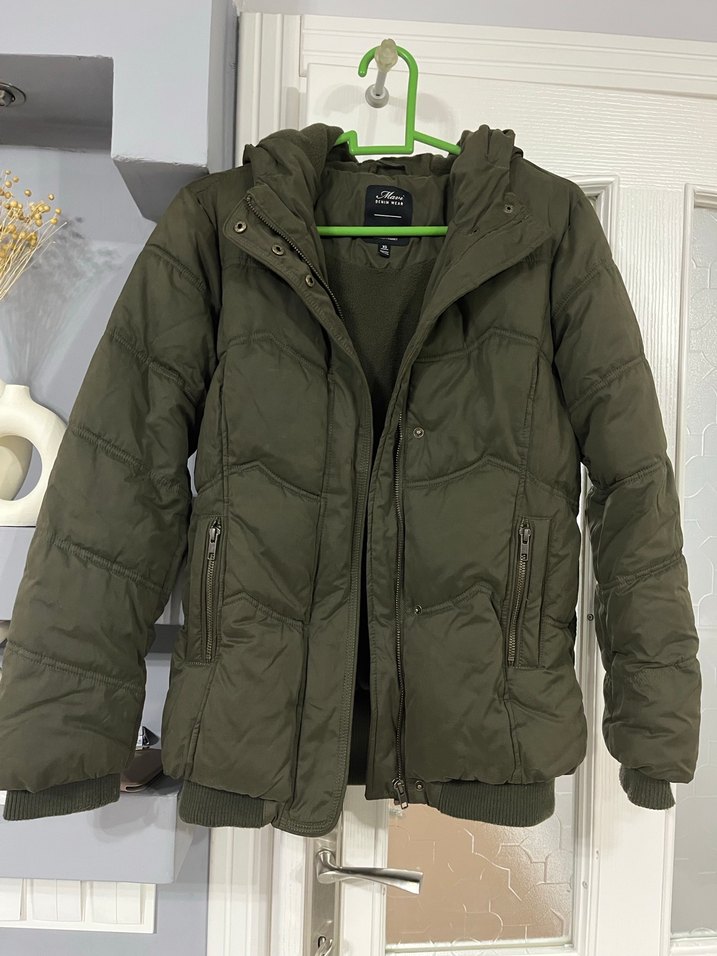 Koyu haki renkli, yumuşak ve sıcak hissettiren kumaştan yapılmış, fermuarlı ve cepli, uzun kollu, kesimi vücuda oturan midi boy kadın mont.