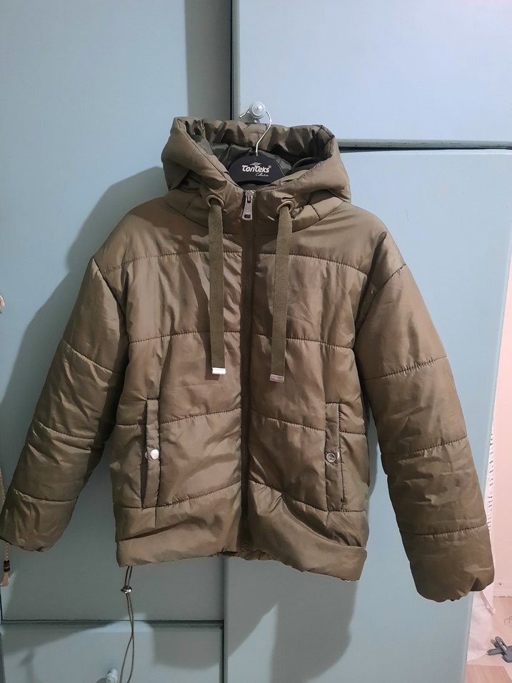 haki, fit kesim, çıtçıtlı cep ve notched yaka detaylı kadın şişme mont. Yumuşak sentetik kumaştan, günlük sokak stiline uygun.