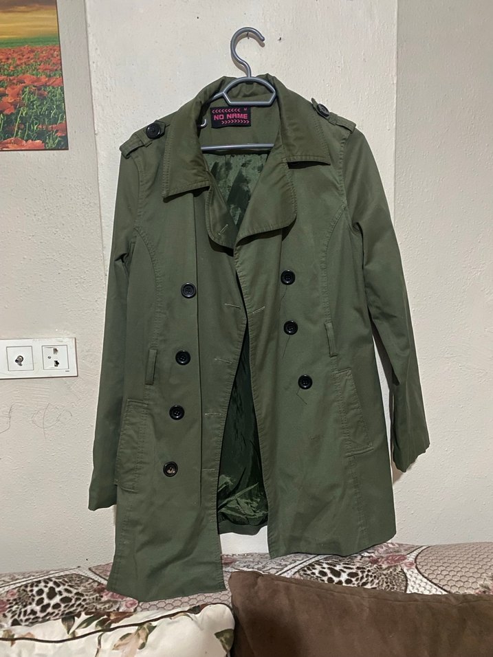 Haki renkli, düğmeli, notalı yakalı kadın midi trençkot. Uzun kollu ve regular fit olan bu trençkot, günlük rahat Paris tarzına uygundur.