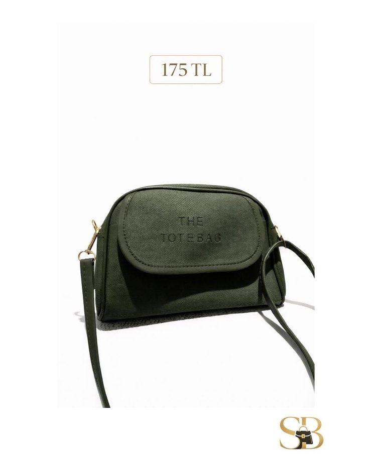 Haki renkte süet kadın omuz çantası, kemerli tasarımı ve baskılı logosu ile trendy günlük sokak stiline uygundur. Fiyat: 175 TL.
