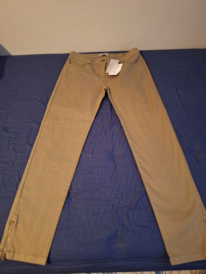 Haki renkte, düz desenli kadın pantolon, normal boyda ve fermuarlı detaylara sahip. Günlük ve sokak stiline uygun rahat kesim.