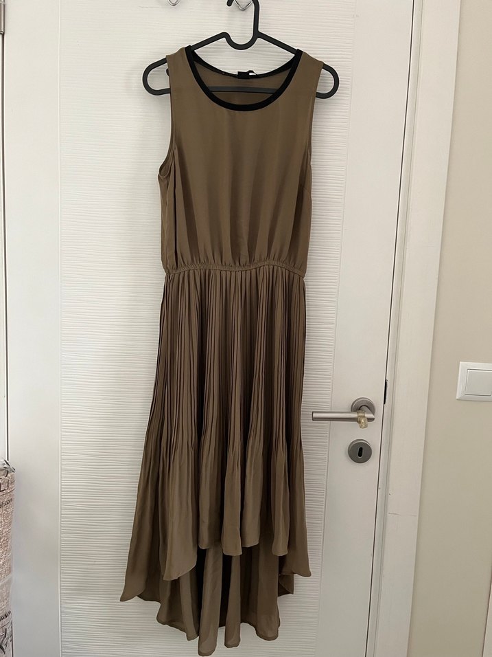 Kolsuz, bisiklet yaka ve pilili etekli uzun elbise. Sentetik kumaştan, bol kesim ve koyu haki renkte, günlük kullanıma uygun.