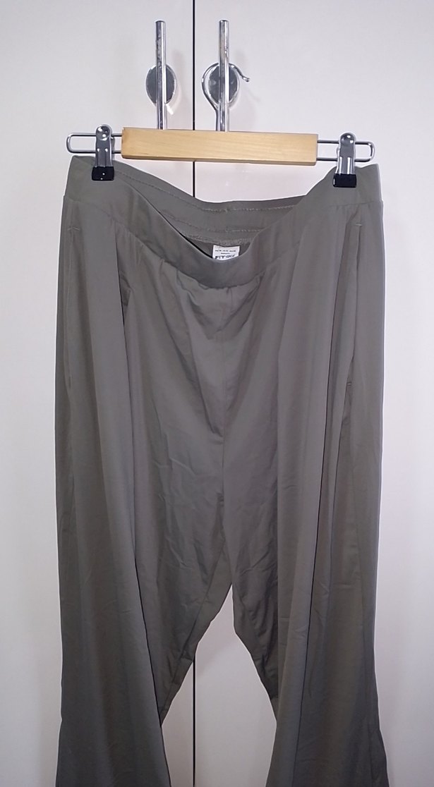 Haki renkte, salaş kesim ve , ipeksi Spor kumaştan kadın pantolon. Minimalist Spor normcore tarzıyla günlük kullanıma uygun.