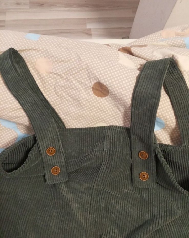 düğmeli askıları ve bol kesimi olan . Yumuşak tekstil kumaştan, bohem tarzda. L beden kadın