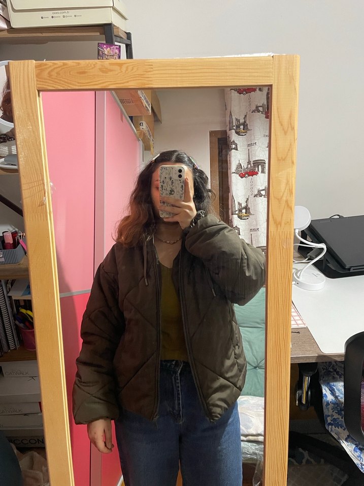 Haki, uzun kollu, şapkalı, yüksek yakalı, puflu ve kadın şişme mont. Kolları lastikli ama sıkmıyor fotoğrafta göstermeye çalıştım. M beden, 160 boy 65 kiloyum bu şekilde gözüküyor ve kalın kazakla da oluyor, hafif bol kalıp. Crop değil ama bel hizasında. İçi şardonlu değil o yüzden terletmiyor. Boyner’in people by fabrika markası. Ölçümleri fermuar tamamen kapalıyken yaptım. Boy: 55 cm, En: 57 cm. Kol boyu: 55 cm. Kol genişliği: 20 cm. Kolunda lastik mevcut fotoğraflarda göstermeye çalıştım