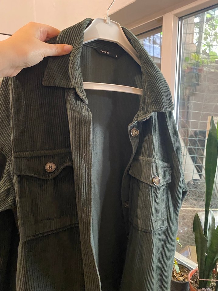 Notlu yaka ve uzun kollu, salaş kesim kadın süet gömlek. Düğmeli ön ve iki göğüs cebi bulunur. Haki renkte, midi boyda günlük kullanıma uygun.