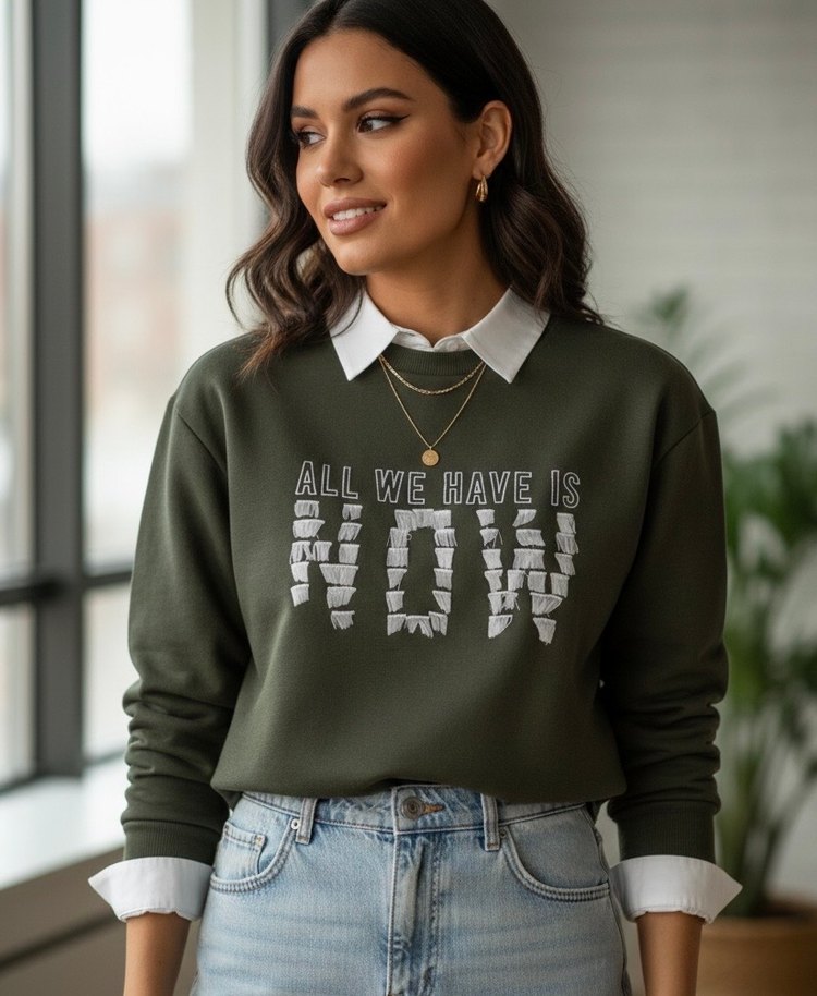 uzun kollu haki sweatshirt. Önünde "ALL WE HAVE IS NOW" yazılı püskül baskı bulunur. Denim görünümlü kumaştan üretilmiştir. ✨
