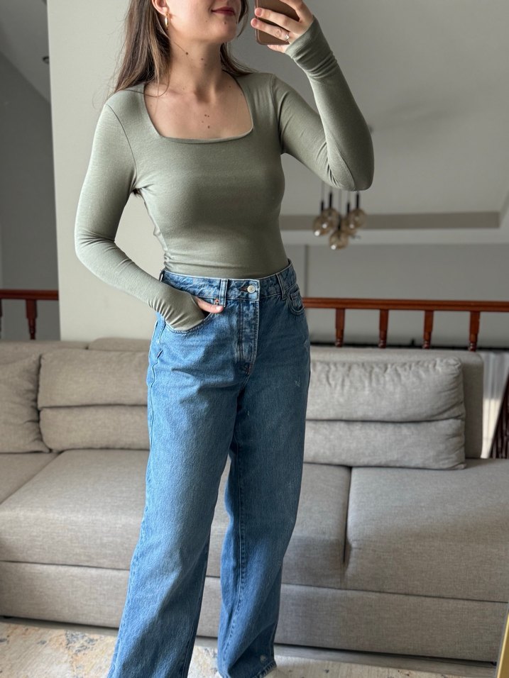 Haki renk, uzun kollu, kare yaka ve bol kesimli denim kumaştan yapılmış rahat kadın bluz. Günlük kullanıma uygun, sade ve şık görünümlü.