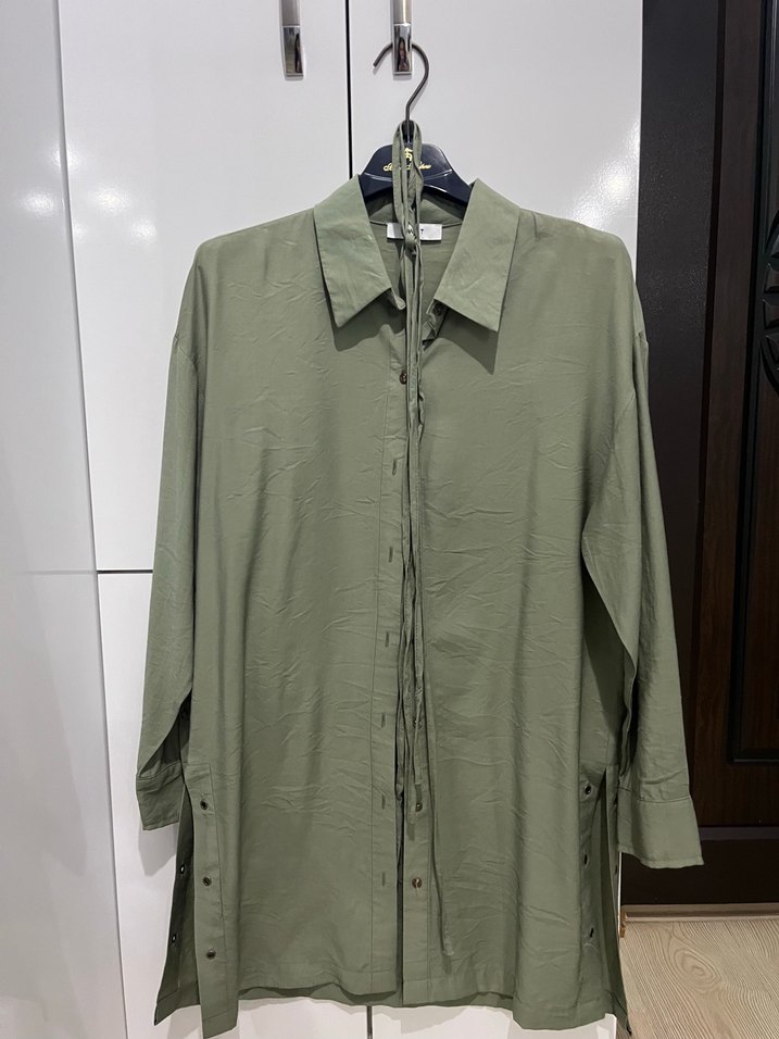 Haki renkli, uzun kollu, keten kumaştan yapılmış, yakalı ve düğmeli, rahat kesimli minimalist kadın gömleği. Günlük kullanıma uygundur.