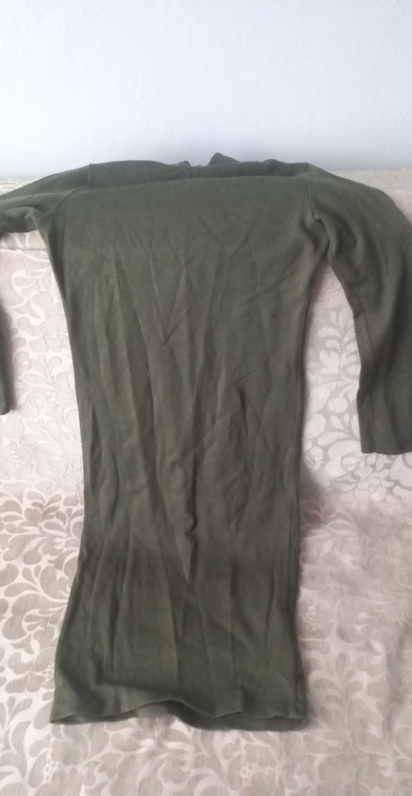 Haki renk, uzun kollu, triko kumaştan yapılmış, vücuda oturan kadın elbisesi. Bisiklet yaka ve drapeli tasarıma sahiptir.