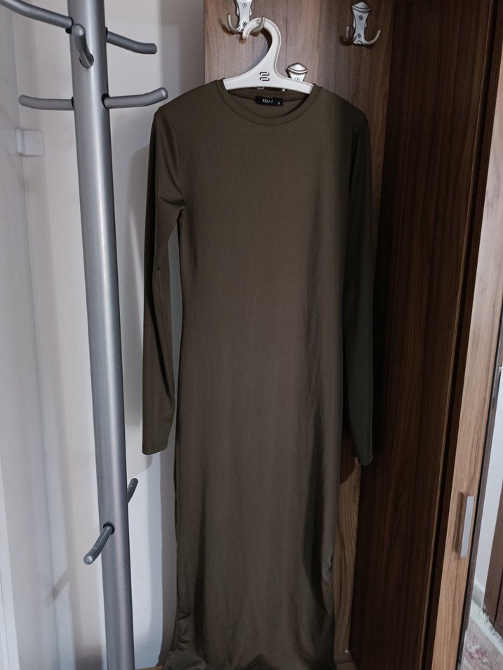 Haki renkte, uzun kollu ve bisiklet yaka tasarıma sahip, vücuda oturan uzun elbise. Sentetik kumaştan yapılmıştır ve sade bir şıklık sunar. hiç kullanılmadı ✨