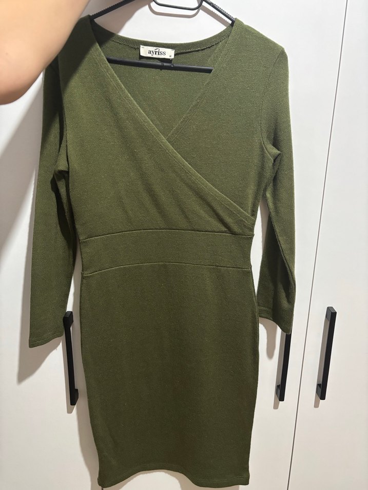 Haki renkli, V yakalı ve uzun kollu triko elbise. Kemerli bel detayı ve midi boy ile sade, günlük sokak stiline uygun. Bi kez giymiştim yeni gibi.
