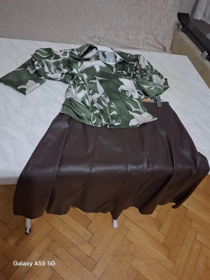 Haki Kamuflaj Desenli saten bluz ve deri etek