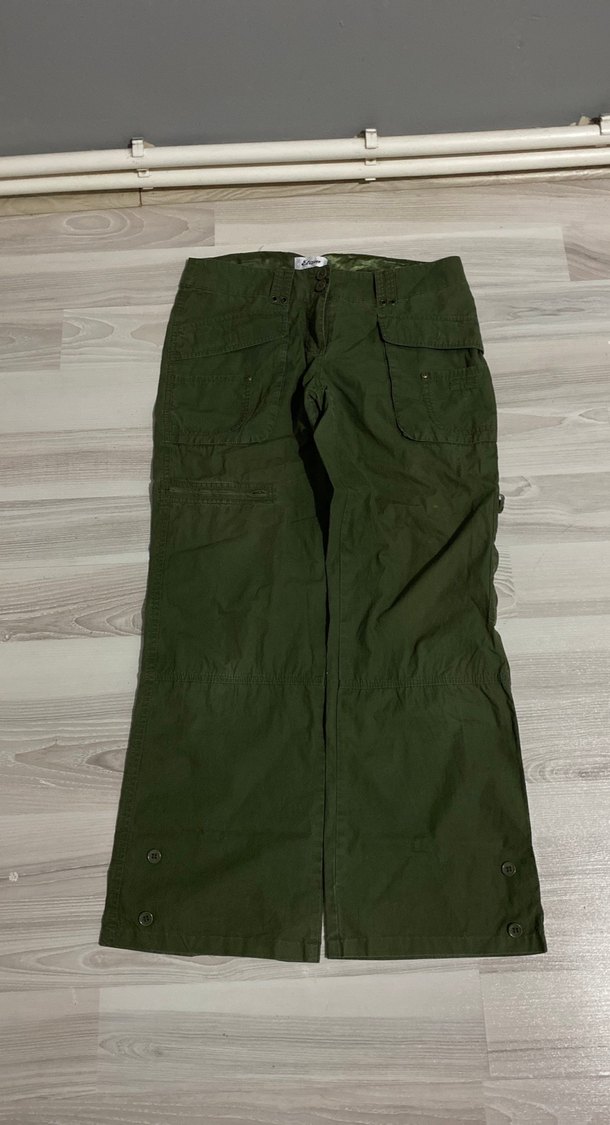 Haki renkte, kamuflaj desenli, bol kesim keten pantolon. Midi boyda ve çoklu ceplidir, dış mekan rahatlığı için uygundur.