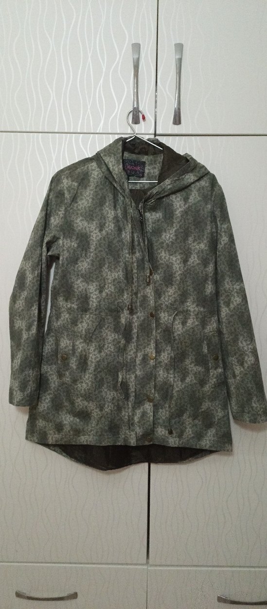 haki kamuflaj desenli, bol kesim uzun kollu kadın ceket. Çentikli yaka ve düğmeli kapanışı ile rahat, sokak tarzı dış giyimdir.