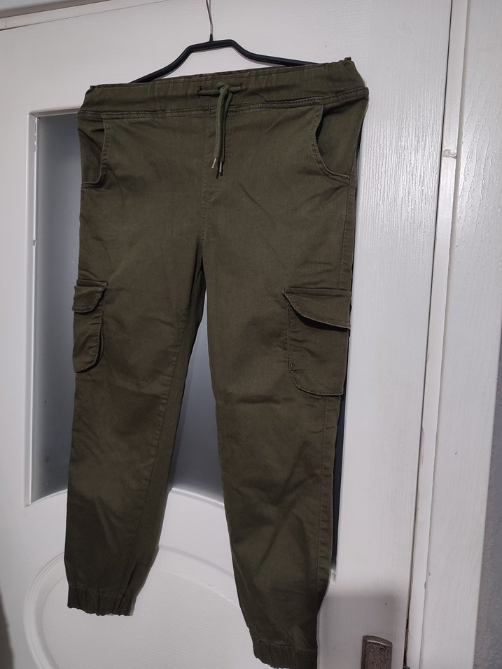 Bol kesim, haki renk kamuflaj desenli kargo pantolon. Kemerli bel ve lastikli paçalar, sentetik kumaştan, dış mekan kullanımı için uygundur. defosu vs yok