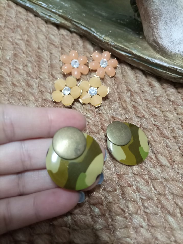 Kısa uzunlukta, düğmeli detaylı haki renk kamuflaj desenli bohem tarzda küpe. Günlük kullanıma uygun.