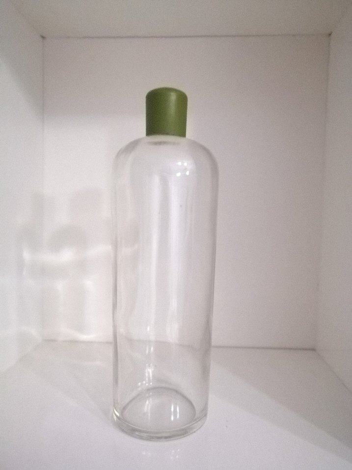 Kolonya şişesi, şeffaf gövde ve açık haki renk kapak ile kolay kullanım sağlar. Büyük boy.