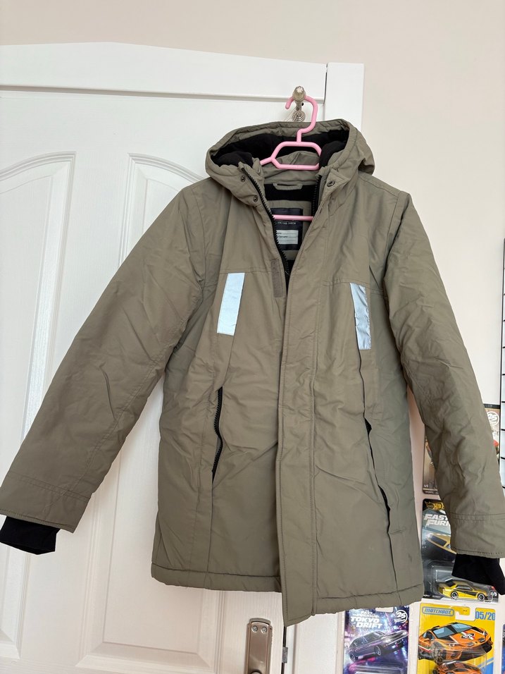 Haki renkte, kapüşonlu ve fermuarlı, sentetik kumaştan yapılmış, uzun kollu ve kesimli erkek çocuk kabanı. Sokak stili ve dış mekan kullanımı için uygundur. Çok az kullanıldı oldukça sıcak tutan mont