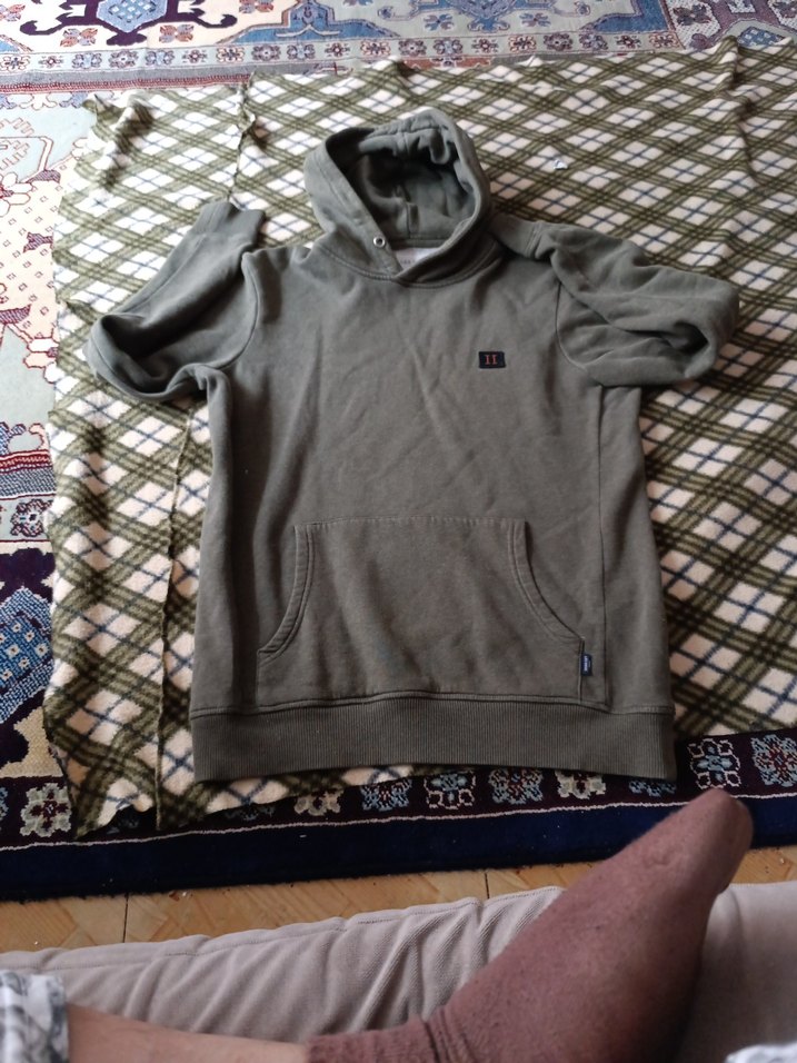 haki renk, kapüşonlu detaylı, rahat kesim erkek sweatshirt. Yumuşak ve sıcak kumaştan, günlük kullanıma uygun.