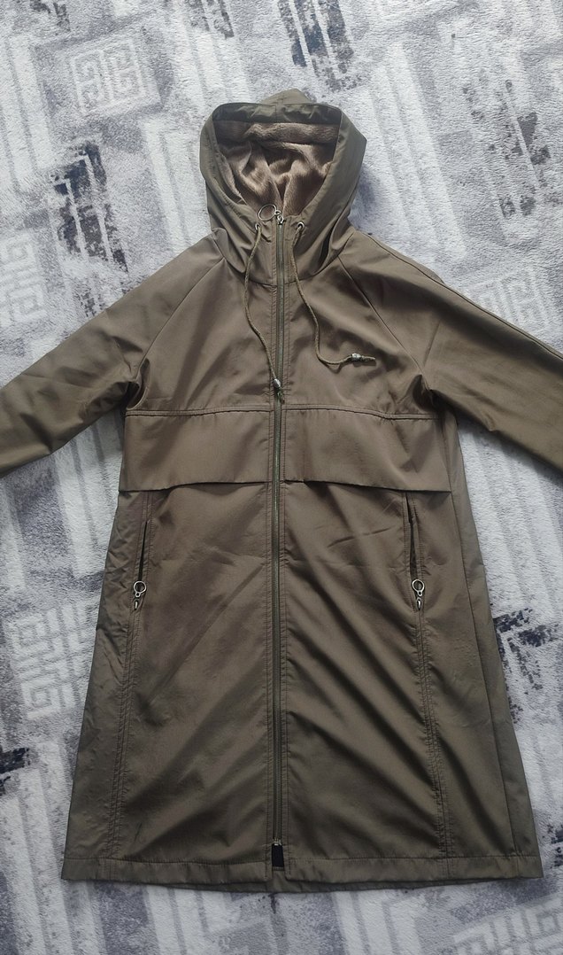 Haki renkli, sentetik kumaştan yapılmış, içi yünlü, kapüşonlu ve fermuarlı kadın rüzgarlık. Uzun kollu ve rahat kesim, dış mekan kullanımı için uygundur. ️
