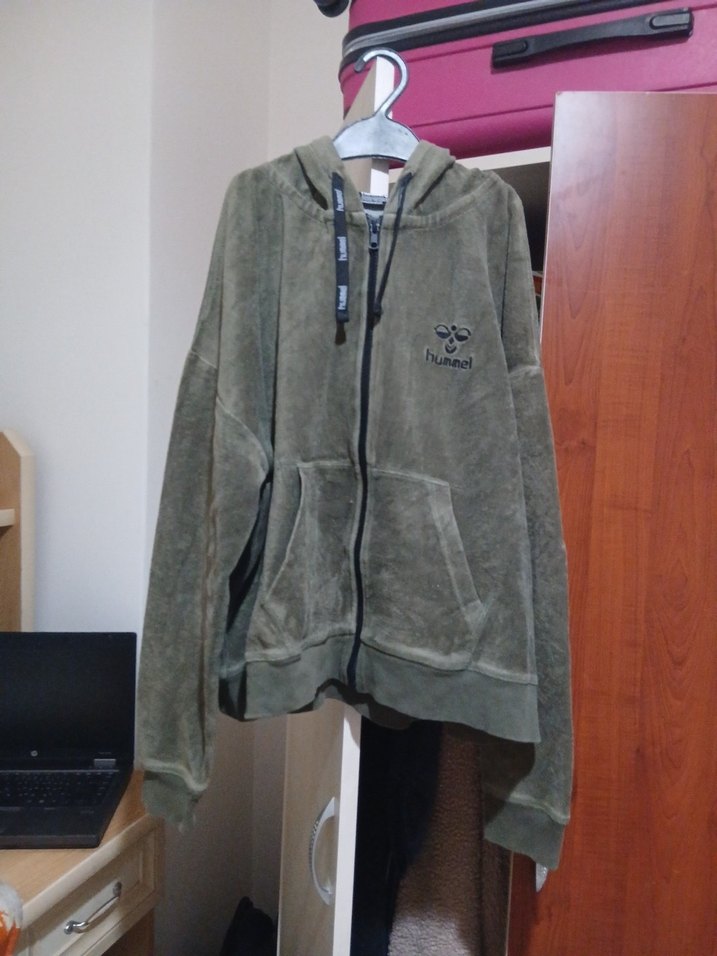 Haki Süet kumaştan, kapüşonlu ve fermuarlı, uzun kollu, rahat kesim kadın ceketi. Günlük kullanıma uygun, konforlu ve casual tarzda.