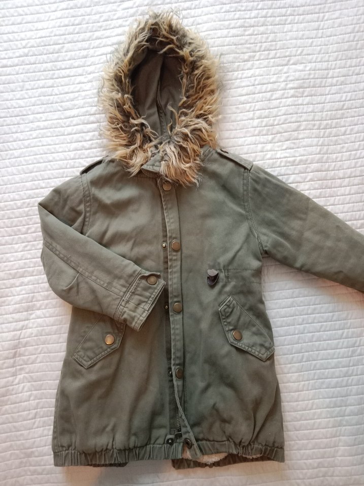 Haki renkte, kapüşonunda kürk detayı bulunan, rahat kesimli kız montu. İçi kürklü sıcak tutar. Rengi solgun haki yeşildir. Resimlerde görüldüğü gibidir.