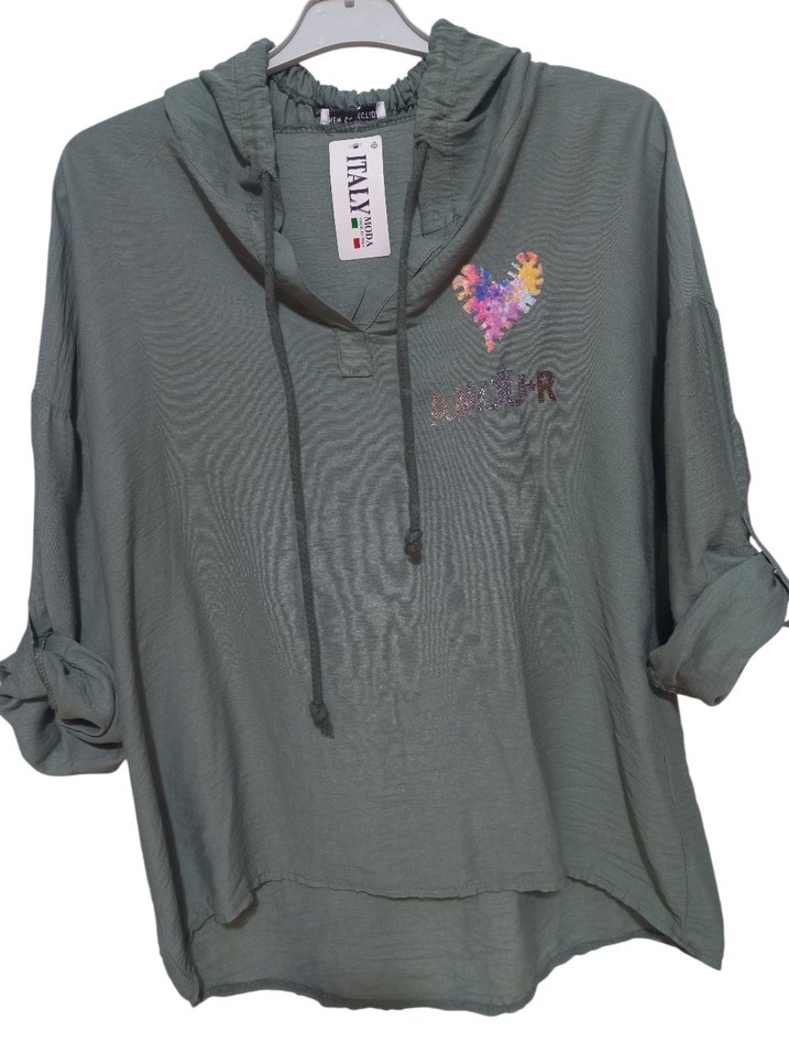 haki kapüşonlu, uzun kollu, düğmeli manşetli, nakış detaylı ve kısa kesim kadın sweatshirtü, rahat ve sokak tarzına uygun.
