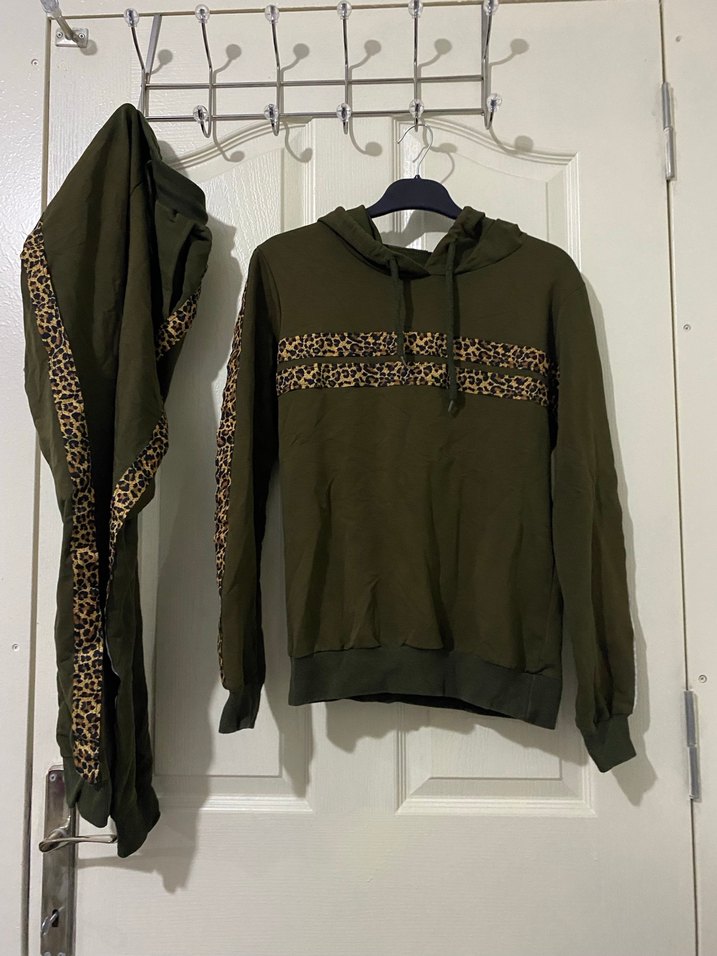 uzun kollu haki kapüşonlu sweatshirt yılan desenli detaylarla. Yumuşak sentetik kumaştan, alt üst takımdır s bedendir