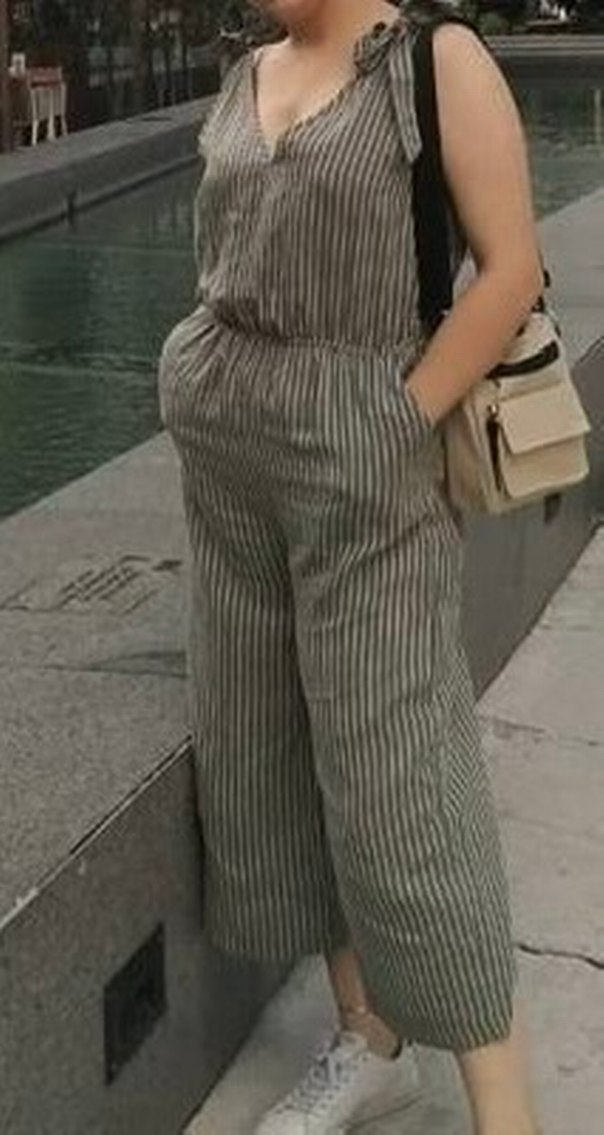 yeşil kareli, straplez yaka ve kolsuz yeşil tulumu. Normal boy ve rahat kesim, dış mekan için uygun. Zahmetsiz şıklık sunar.