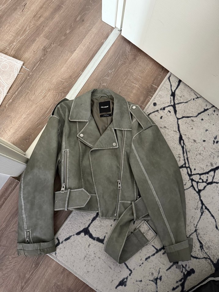 haki kumaştan yapılmış, kemerli, kısa kesim ve bol kesim kadın deri ceket. en fazla 5 kez giymişimdir.M beden ama L bedene de uyumlu olur.