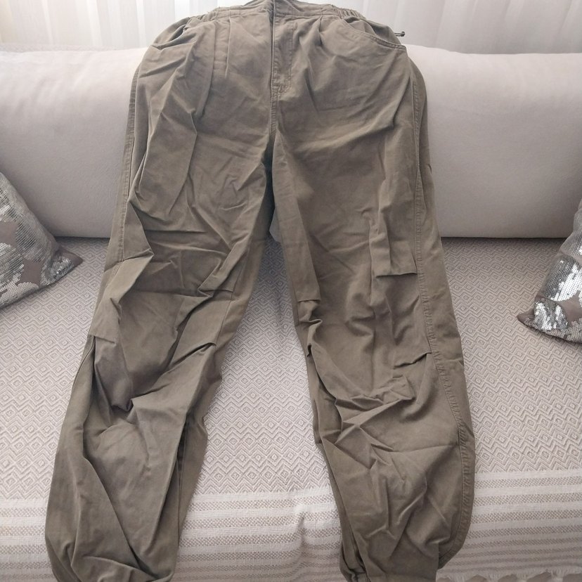haki keten kumaştan, bol kesim ve kemerli, normal boyda kadın pantolonu. Sokak stiline uygun, desensiz ve dış mekan kullanımı için idealdir.