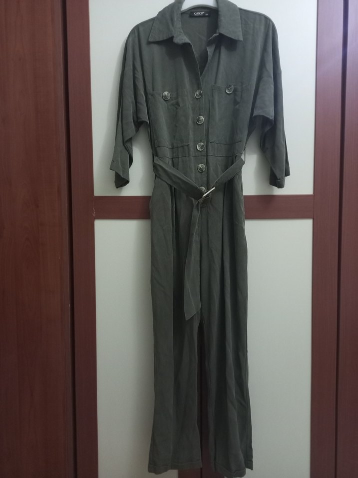 haki renkli uzun tulum, yakalı ve uzun kolludur. Nefes alabilen tensel kumaştan yapılmış, kemerli ve normal kesimdir. Trend sokak stili için uygundur.