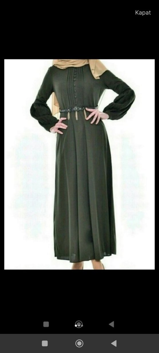 Haki, uzun kollu, yüksek yakalı ve kemerli bel detaylı bol kesim uzun elbisedir. Sentetik kumaştan yapılmıştır ve mütevazı, klasik gotik tarzı yansıtır.