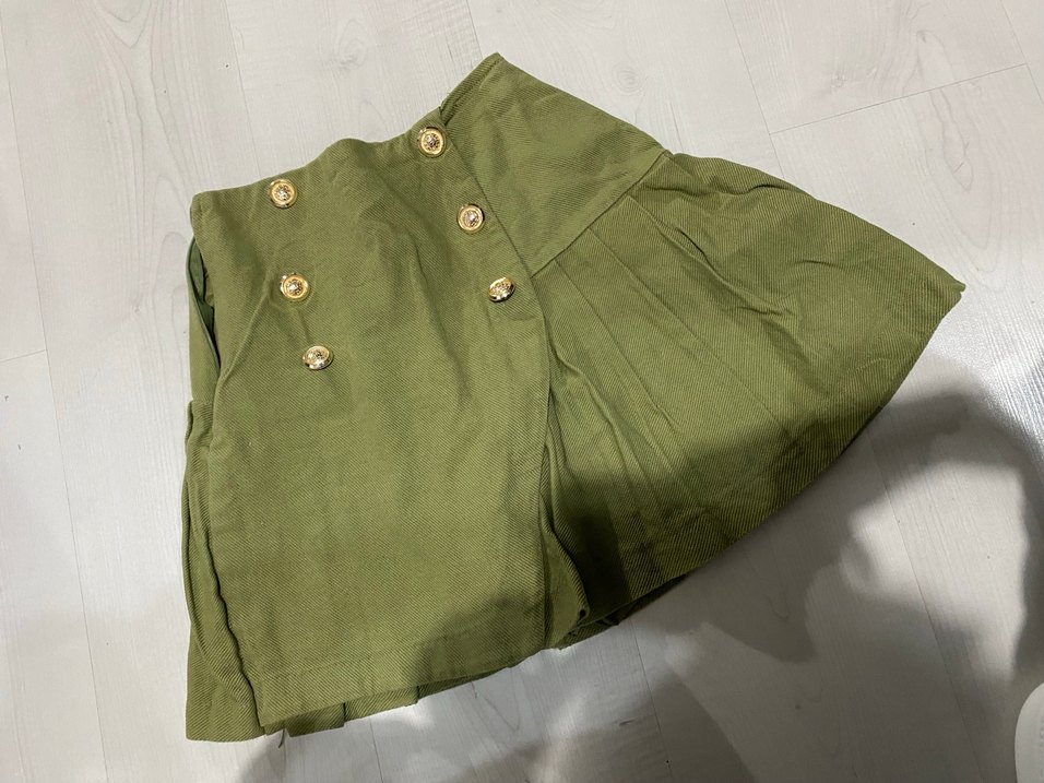 Kız çocukları için bol kesim, parlak haki renkli keten kumaştan yapılmış ve düğme detayları bulunan sade bir sokak stili eteği.