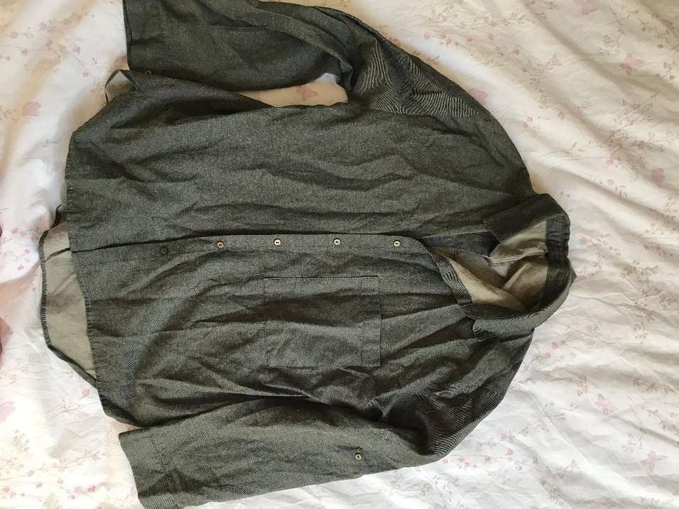 haki keten kumaştan, düğmeli ve kesimli yakalı, bol kesim uzun kollu gömlek. Günlük kullanıma uygun normal boyda.
