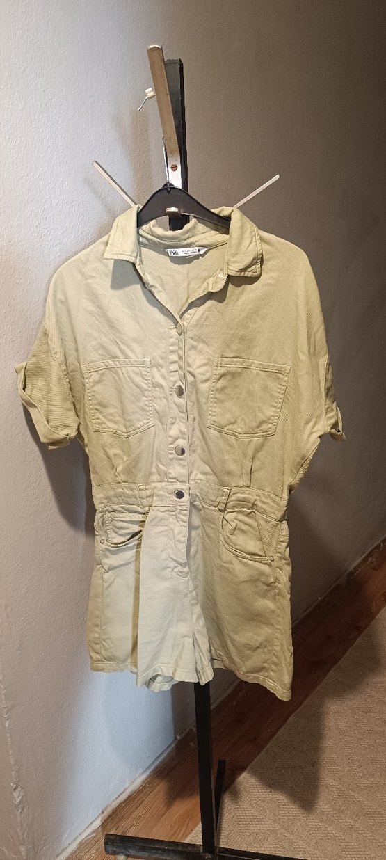 haki renkli keten kumaştan yapılmış, kısa kollu, düğmeli, bol kesim kadın mini tulum. Sokak tarzı için uygun, cepli ve yakalı.
