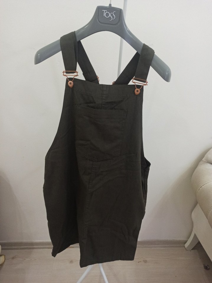 Haki renk keten mini askılı hamile tulum, ayarlanabilir askılı ve bol kesimlidir. Cep detaylı, rahat ve günlük sokak stili için uygundur. barrels oil markadır