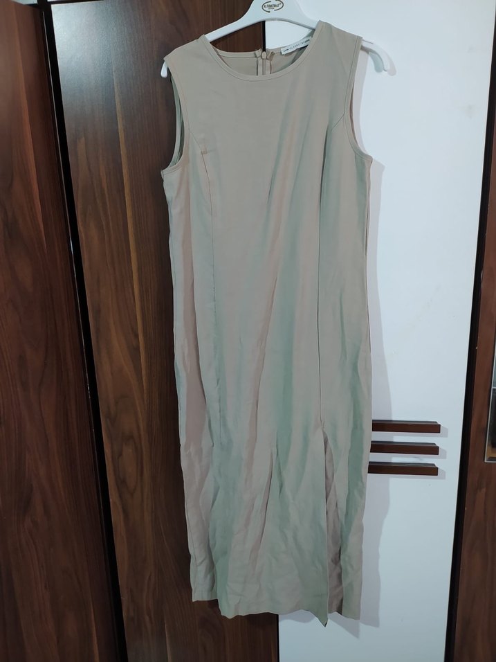 Kolsuz, keten kumaştan yapılmış uzun bej elbise. Dökümlü ve regular fit, askısız yakasıyla minimalist tarz için uygun.