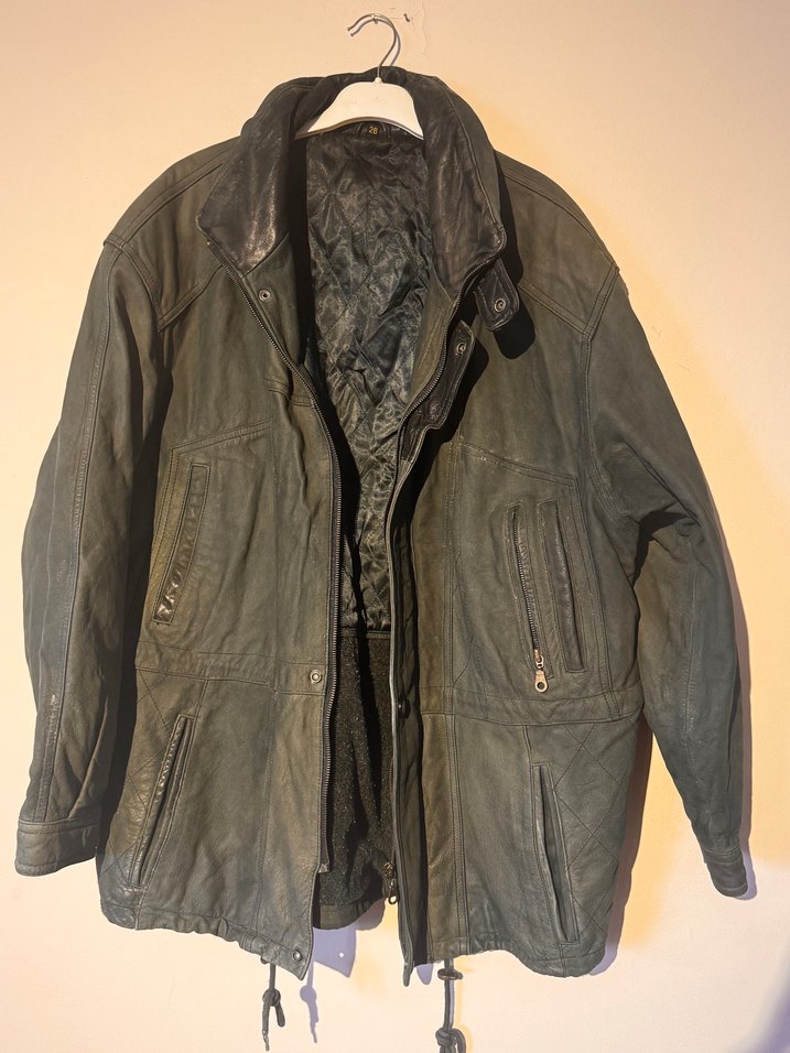 Gri haki koyu yeşil görünümlü oversize büyük beden kesimli deri biker ceket, kemerli ve salaş kesimdir. Rengi ışık ta değişmektedir. Normal boy ve uzun kolludur, günlük kullanım için uygundur. 80boy en 60. Defo yok