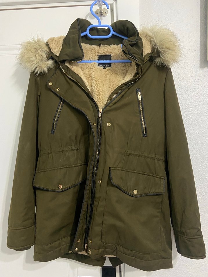 Haki , kürklü kapüşonlu, yumuşak iç astarlı, çıtçıtlı ve fermuarlı cepli, uzun kollu, bol kesim, orta boy kadın kış montu.