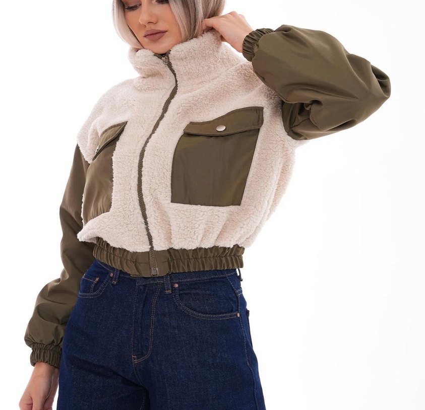 Kısa, bol kesim kadın ceketi, boğazlı yaka ve uzun kolludur. Kürk detaylı, haki cepli ve kollu rahat sokak stili için uygundur. Marka:FullaModa