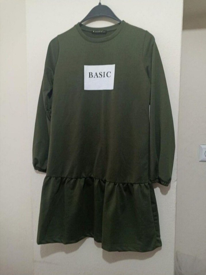 Haki midi tunik, uzun kollu ve bol kesim. Önünde 'BASIC' yazılı baskı, yuvarlak yaka, yumuşak sentetik kumaş.