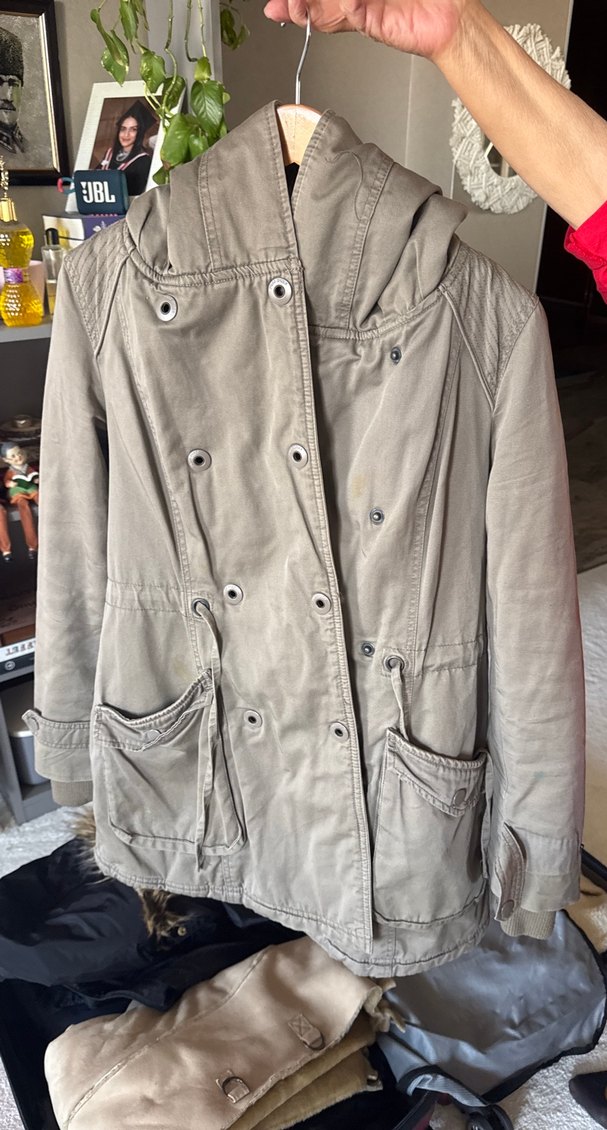 Haki renkli, düğmeli, normal uzunlukta midi kadın ceket. Notlu yaka, uzun kollu ve rahat kesim. Yumuşak keten kumaştan, sokak stiline uygun.