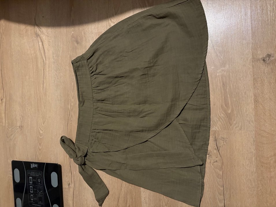 Haki renkli, keten kumaştan midi boy, bol kesim ve drapeli hamile eteği. Minimalist bohem tarzıyla günlük kullanıma uygundur.