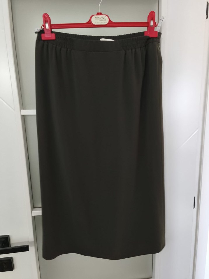 haki midi etek, düz kesim ve kemerli bel detayına sahiptir. Düz ve sade tasarımıyla ofis için uygundur. belinde lastik olduğu için 38 40 uyumlu M