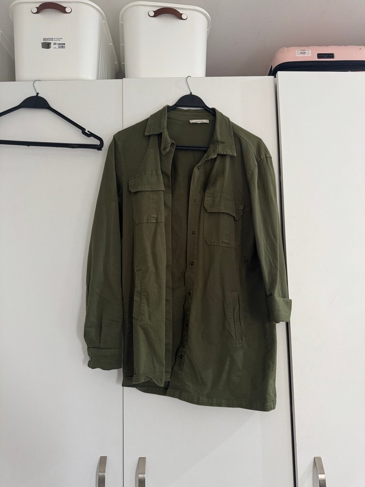 Haki keten kumaştan, bol kesim ve çıtçıtlı önüyle midi uzunlukta kadın ceketi. Uzun kollu, minimal tasarım, günlük sokak stiline uygun.